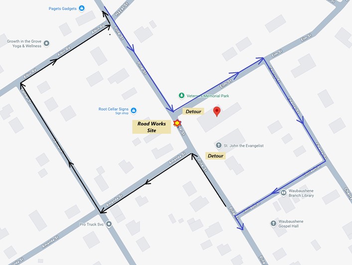 Please be advised there is a road closure today on Pine Street in Waubaushene between Albin Road and Amanda Road until approximately 7:00 p.m. while crews work to complete a utility connection.