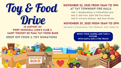 Help those in need this time of year and support the Toy & Food Drive in partnership with the Tay Township Fire Department, Saint Vincent de Paul Tay Food Bank and Port McNicoll Lion's Club.